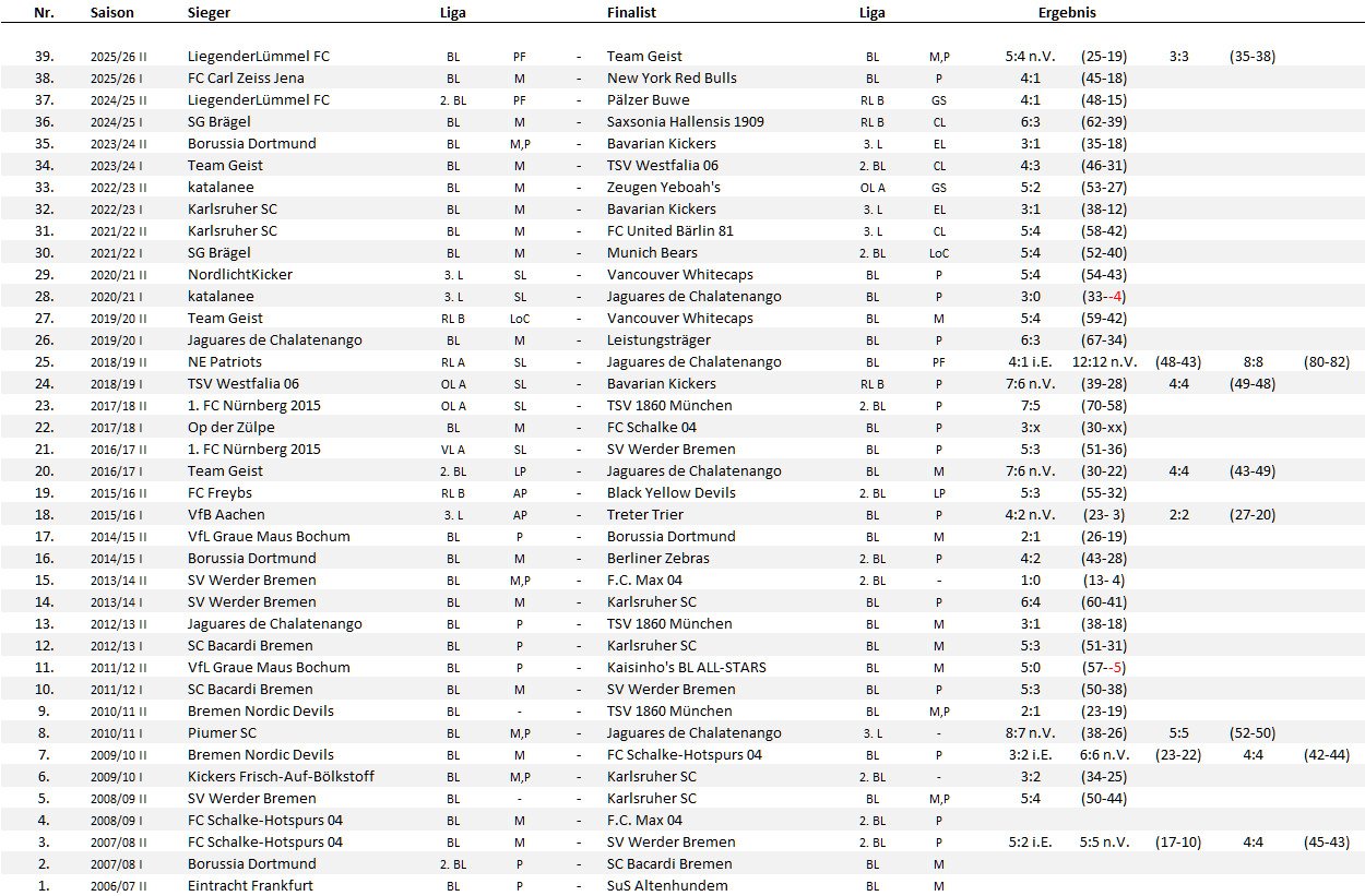 2026/27 I 2025/26 II LiegenderLümmel FC BL 2025/26 I FC Carl Zeiss Jena BL 2024/25 II LiegenderLümmel FC 2.BL 2024/25 I SG Brägel BL 2023/24 II Borussia Dortmund BL 2023/24 I Team Geist BL 2022/23 II katalanee BL 2022/23 I Karlsruher SC BL 2021/22 II Karlsruher SC BL 2021/22 I SG Brägel BL 2020/21 II NordlichtKicker 3.L 2020/21 I katalanee 3.L 2019/20 II Team Geist RL B 2019/20 I Jaguares de Chalatenango BL 2018/19 II NE Patriots RL A 2018/19 I TSV Westfalia 06 OL A 2017/18 II 1. FC Nürnberg 2015 OL A 2017/18 I Op der Zülpe BL 2016/17 II 1. FC Nürnberg 2015 VL A 2016/17 I Team Geist 2.BL 2015/16 II FC Freybs RL B 2015/16 I VfB Aachen 3.L 2014/15 II VfL Graue Maus Bochum BL 2014/15 I Borussia Dortmund BL 2013/14 II SV Werder Bremen BL 2013/14 I SV Werder Bremen BL 2012/13 II Jaguares de Chalatenango BL 2012/13 I SC Bacardi Bremen BL 2011/12 II VfL Graue Maus Bochum BL 2011/12 I SC Bacardi Bremen BL 2010/11 II Bremen Nordic Devils BL 2010/11 I Piumer SC BL 2009/10 II Bremen Nordic Devils BL 2009/10 I Kickers Frisch-Auf-Bölkstoff BL 2008/09 II SV Werder Bremen BL 2008/09 I FC Schalke-Hotspurs 04 BL 2007/08 II FC Schalke-Hotspurs 04 BL 2007/08 I Borussia Dortmund 2.BL 2006/07 II Eintracht Frankfurt BL