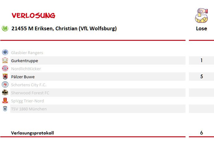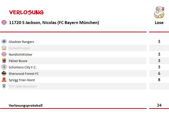 01. Pälzer Buwe 502. Schortens City F.C. 503. NordlichtKicker 504. Schortens City F.C. 405. Sherwood Forest FC 606. Pälzer Buwe 407. Sherwood Forest FC 508. Sherwood Forest FC 409. NordlichtKicker 410. SpVgg Trier-Nord 811. SpVgg Trier-Nord 712. SpVgg Trier-Nord 613. Pälzer Buwe 314. Pälzer Buwe 215. Sherwood Forest FC 316. SpVgg Trier-Nord 517. Schortens City F.C. 318. SpVgg Trier-Nord 419. Schortens City F.C. 220. Sherwood Forest FC 221. Glasbier Rangers 522. Sherwood Forest FC 123. Glasbier Rangers 424. NordlichtKicker 325. Schortens City F.C. 126. Glasbier Rangers 327. Glasbier Rangers 228. Pälzer Buwe 129. SpVgg Trier-Nord 330. NordlichtKicker 231. NordlichtKicker 132. Glasbier Rangers 133. SpVgg Trier-Nord 234. SpVgg Trier-Nord 1