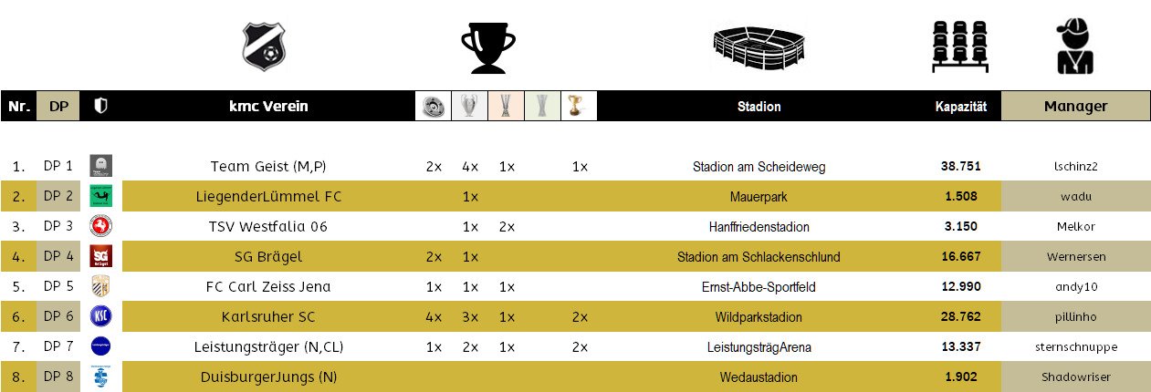 #1 | Ligadaten | Alle kmc Meister | Alle Gewinner der kmc Torjägerkanone | Ewige Tabelle