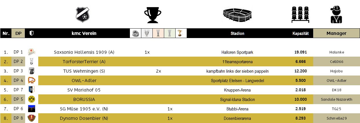 2025/26 II 2025/26 I Schönhauser SpVgg 2024/25 II Green Penguins Hodenhagen 2024/25 I Pälzer Buwe 2023/24 II Saxsonia Hallensis 1909 2023/24 I TUS Wehmingen 2022/23 II OWL-Adler 2022/23 I LiegenderLümmel FC 2021/22 II BVBierussia 2021/22 I Pälzer Buwe 2020/21 II Bavarian Kickers 2020/21 I TUS Wehmingen 2019/20 II Bongo Combo FC 2019/20 I katalanee 2018/19 I SV Kippstadt 0,8 2017/18 II Gelbe Wand 2017/18 I Nodda United 72 2016/17 II NY Yellow Cabs 2016/17 I Gelbe Wand 2015/16 II Bongo Combo FC 2015/16 I FC Freybs 2014/15 II Gelbe Wand