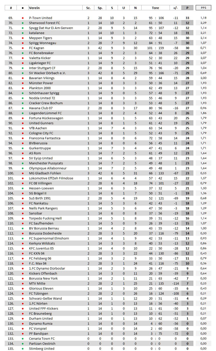 2025/26 II 2025/26 I SG Müse 1905 e.V. 2024/25 II SV Mariahof 05 2024/25 I SV Garant 1905 2023/24 II SV Mariahof 05 2023/24 I TarforsterTerrier 2022/23 II SV WerhatDeLigtausgemacht 2022/23 I SV Mariahof 05 2021/22 II SV Eule Trier/Kenn 2021/22 I LiegenderLümmel FC 2020/21 II O-Town Magic 2020/21 I Krempel Packers 2019/20 II 1. SV DG Hodenhagen 2019/20 I VfB Aachen 2018/19 II katalanee 2018/19 I Pälzer Buwe 2017/18 II TUS Wehmingen 2017/18 I Cosmos NY 2016/17 II Athletic Horas 2016/17 I NY Yellow Cabs 2015/16 II Mensch ist der United 2015/16 I Borussia Boerholz 2012