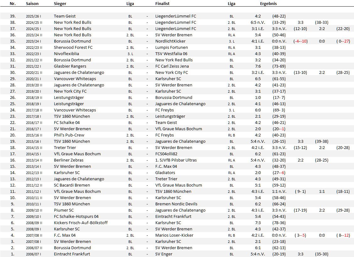 2025/26 II 2025/26 I Team Geist BL 2024/25 II New York Red Bulls BL 2024/25 I New York Red Bulls BL 2023/24 II New York Red Bulls 2.BL 2023/24 I Borussia Dortmund BL 2022/23 II Sherwood Forest FC 2.BL 2022/23 I Nivoflexiblia 3. L 2021/22 II Borussia Dortmund 2.BL 2021/22 I Glasbier Rangers 2.BL 2020/21 II Jaguares de Chalatenango BL 2020/21 I Vancouver Whitecaps BL 2019/20 II Jaguares de Chalatenango BL 2019/20 I New York City FC BL 2018/19 II Leistungsträger BL 2018/19 I Leistungsträger BL 2017/18 II Vancouver Whitecaps BL 2017/18 I TSV 1860 München 2.BL 2016/17 II FC Schalke 04 BL 2016/17 I SV Werder Bremen BL 2015/16 II Phil's Pub-Crew 2.BL 2015/16 I TSV 1860 München 2.BL 2014/15 II Treter Trier BL 2014/15 I VfL Graue Maus Bochum BL 2013/14 II Berliner Zebras 2.BL 2013/14 I SV Werder Bremen BL 2012/13 II Karlsruher SC BL 2012/13 I Jaguares de Chalatenango BL 2011/12 II SC Bacardi Bremen BL 2011/12 I VfL Graue Maus Bochum BL 2010/11 II SV Werder Bremen BL 2010/11 I TSV 1860 München BL 2009/10 II Piumer SC BL 2009/10 I FC Schalke-Hotspurs 04 BL 2008/09 II Kickers Frisch-Auf-Bölkstoff BL 2008/09 I Karlsruher SC BL 2007/08 II F.C. Max 04 2.BL 2007/08 I SV Werder Bremen BL 2006/07 II Borussia Dortmund 2.BL 2006/07 I Eintracht Frankfurt BL