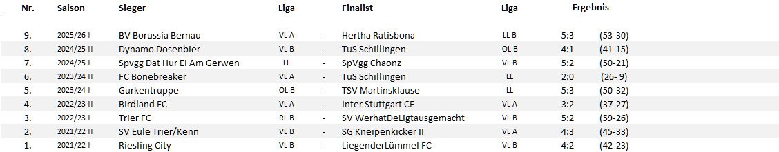 2025/26 II 2025/26 I BV Borussia Bernau2024/25 II Dynamo Dosenbier2024/25 I Spvgg Dat Hur Ei Am Gerwen2023/24 II FC Bonebreaker2023/24 I Gurkentruppe2022/23 II Birdland FC2022/23 I Trier FC2021/22 II SV Eule Trier/Kenn2021/22 I Riesling City